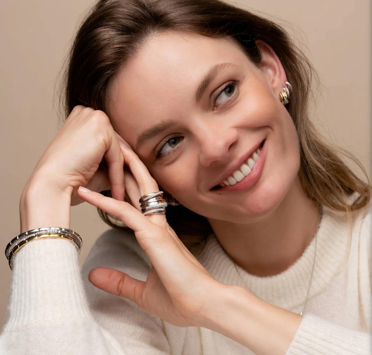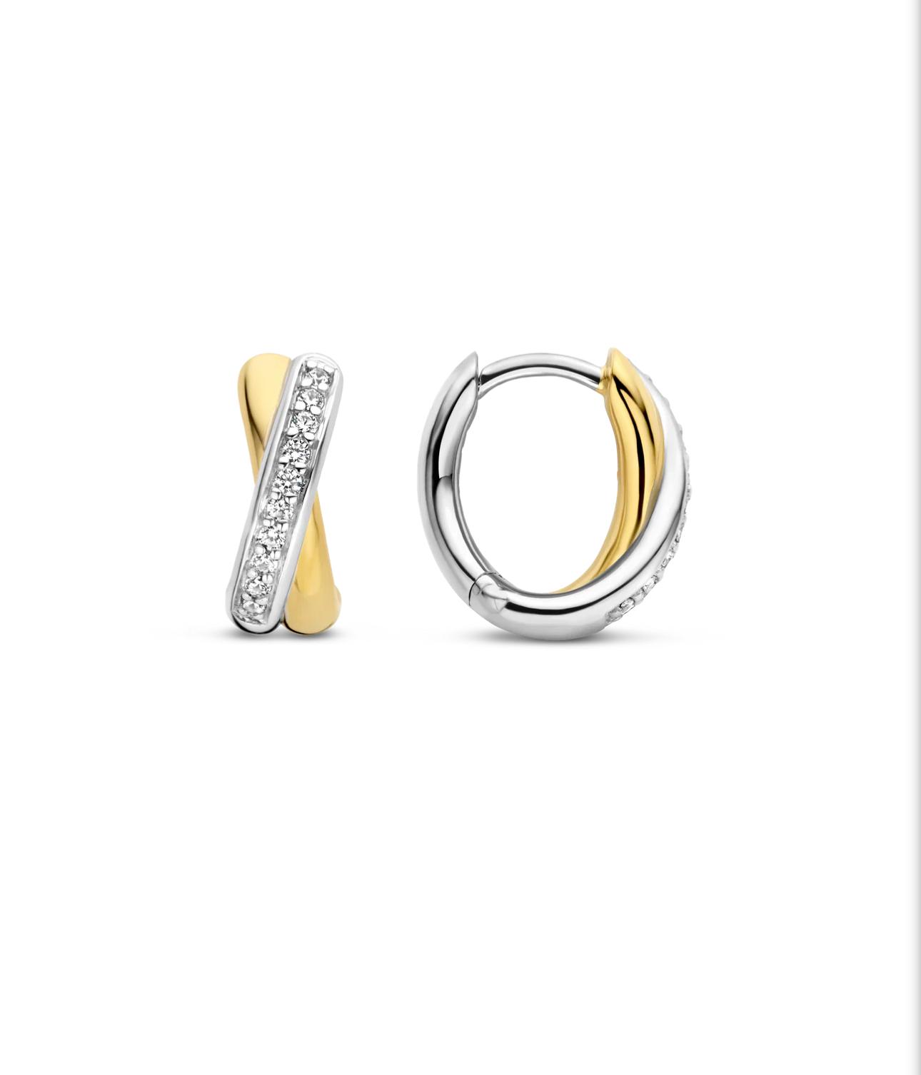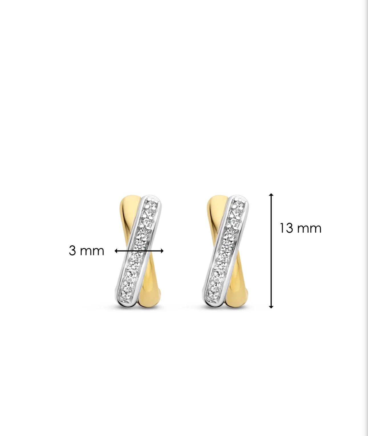 Ti Sento minđuše sa dva prepletena kruga . Jedan krug je pozlaćeni dok je drugi sa malim belim cirkonima. Kombinujte ih sa alkama i kreirajte svoj stil.