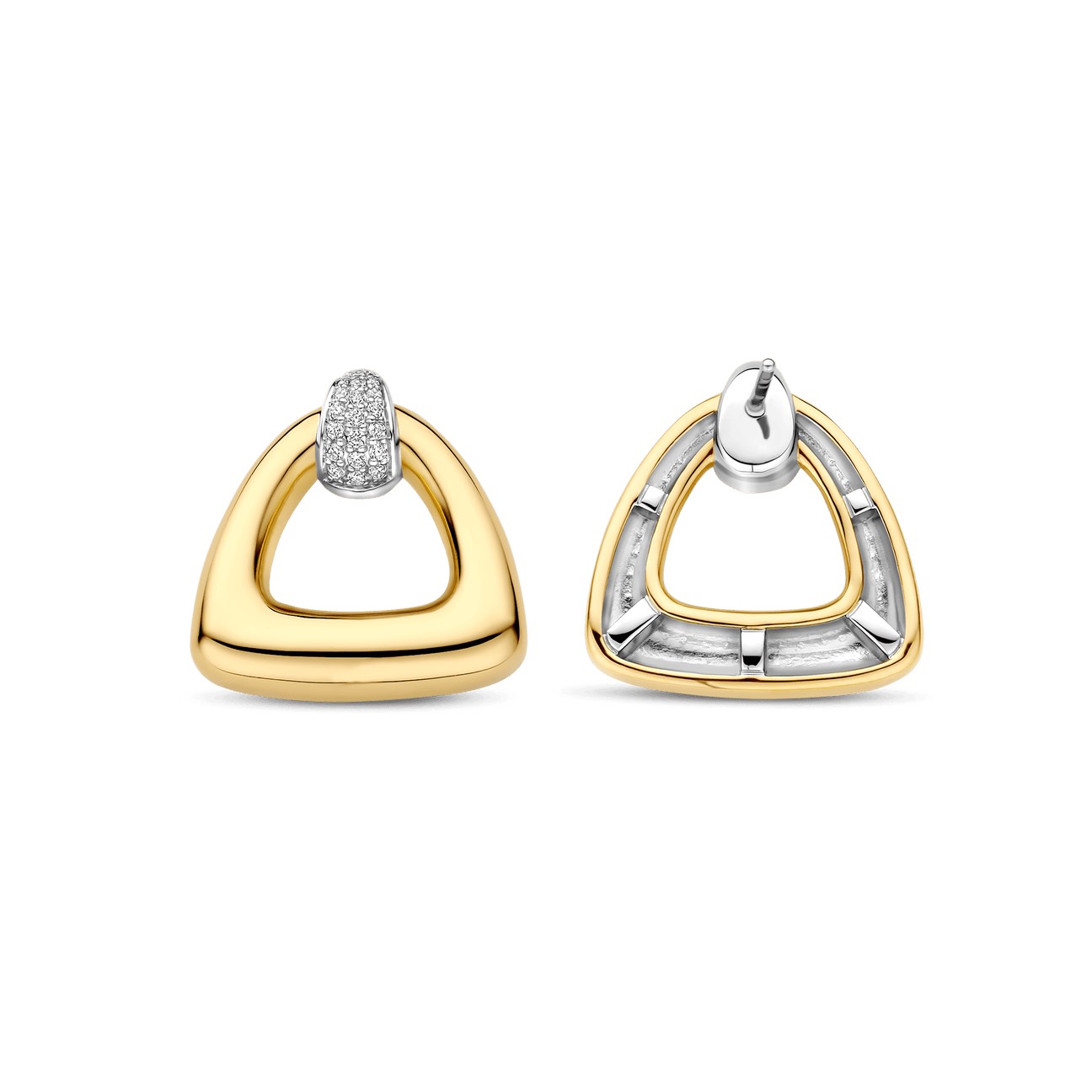 Prepustite se luksuzu uz ove dvobojne srebrne minđuše. Izrađene od srebra 925, skulpturalne, otvorene trouglaste kapice su prekrivene blistavom pozlatom, a njihove smele krivine polirane do ogledalskog sjaja. Neka par stoji samostalno kao centralni akcenat ili ih kombinujte sa odabranim naušnicama za povecan kontrast.