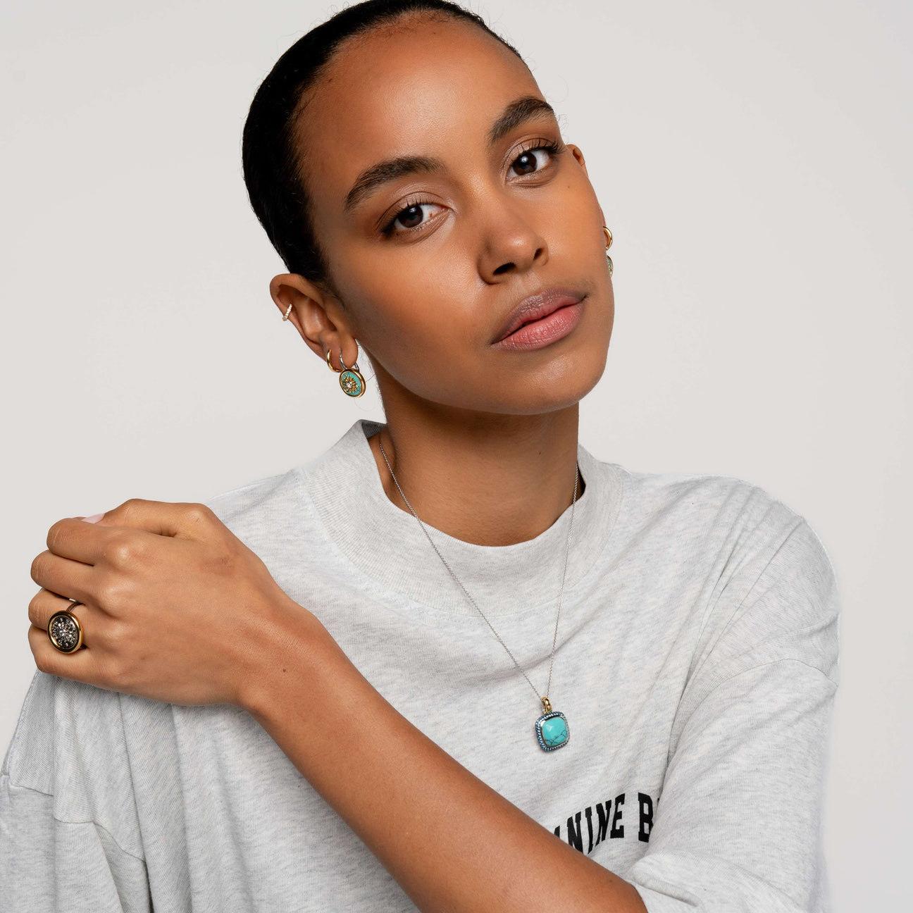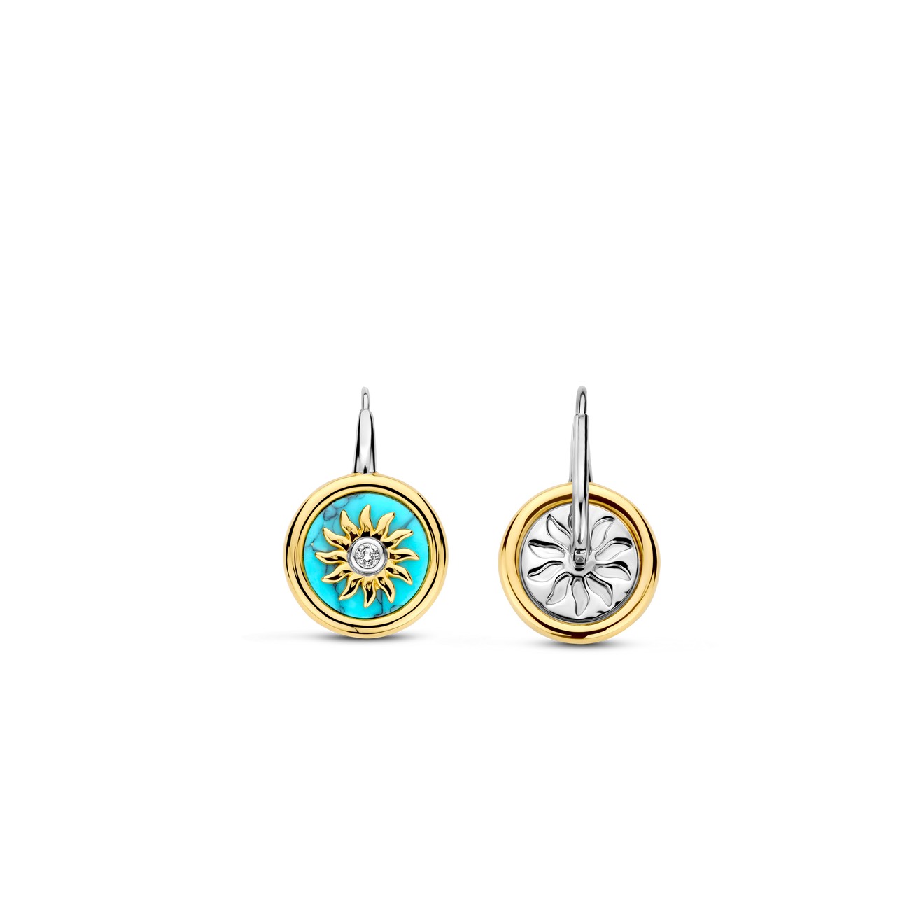 Ove pozlaćene tirkizne Ti Sento minđuše predstavljaju blistavu fuziju letnjeg šarma i živahne elegancije. Fuzija sedefa i žuto pozlaćenih akcenata stvara upečatljiv komad koji oteletvoruje luksuz i modernu klasičnu privlačnost. Nosite ih same za minimalistički izgled.