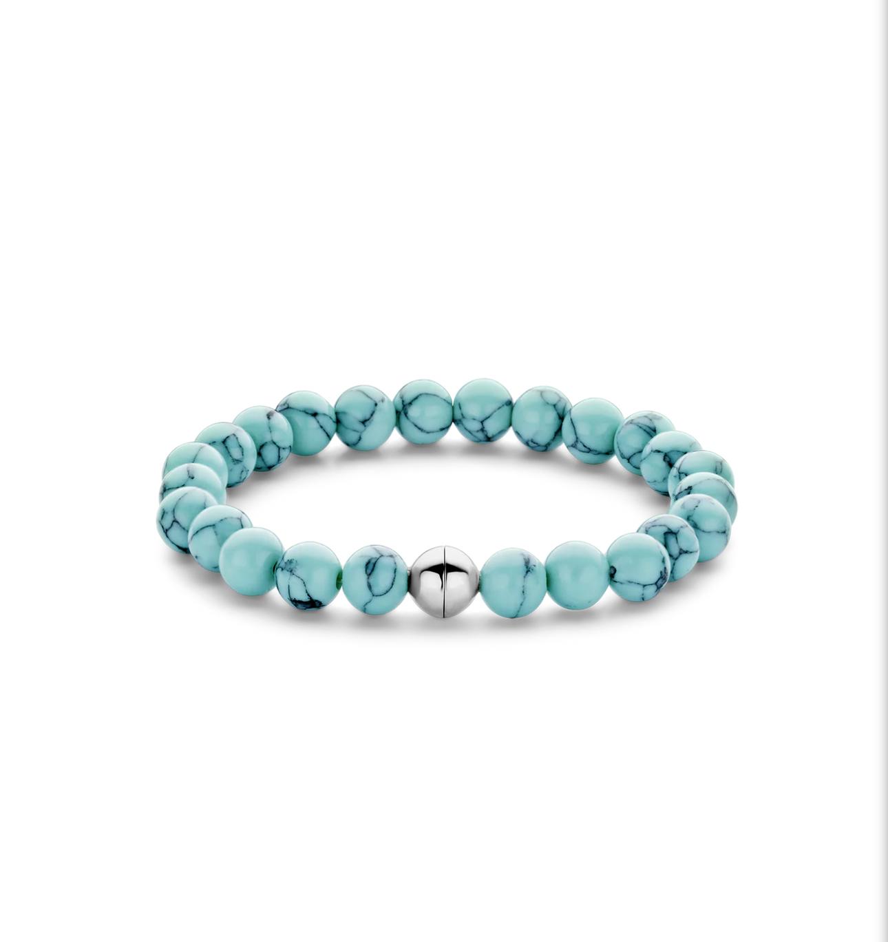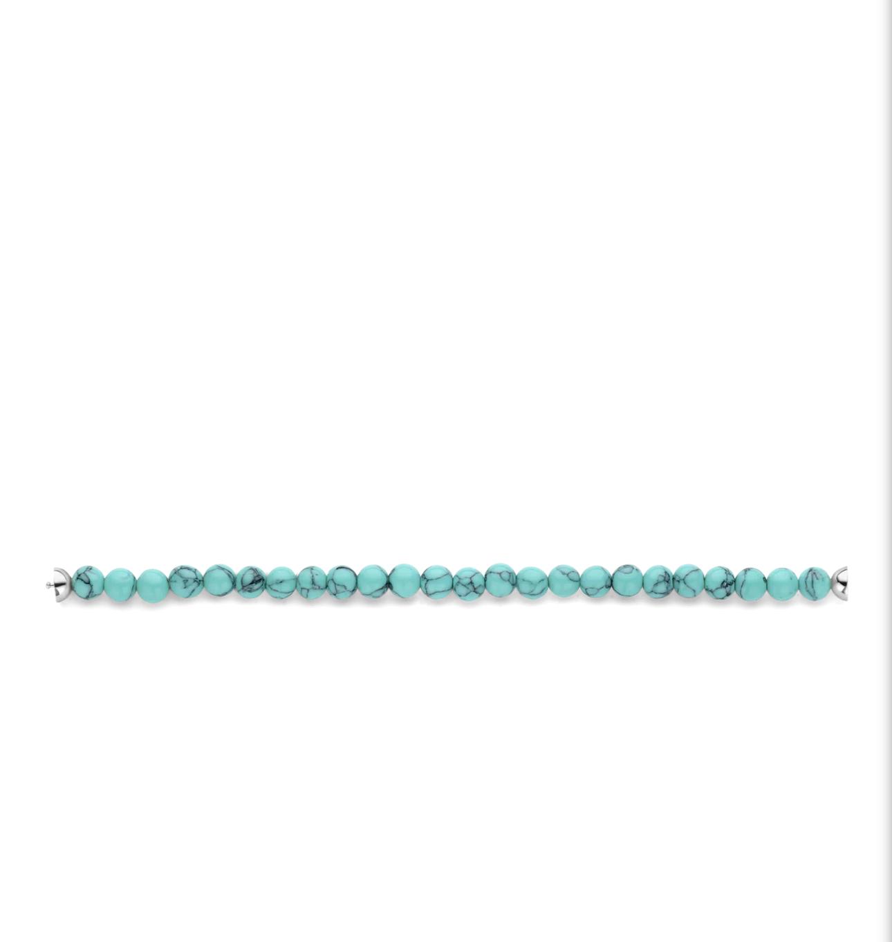Ova Ti Sento srebrna narukvica krasi se nizom tirkiznih perli i srebrnom kopčom lepo integrisanom u dizajn. Njena tirkizna boja priziva nijanse okeana i vašeg predstojećeg odmora. Dodajte malo tirkizne boje svojoj odevnoj kombinaciji, život je uvek uzbudljiviji u boji.