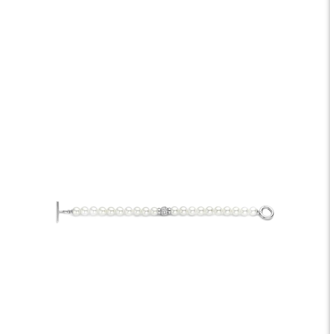 Elegantna Ti sento narukvica napravljena od belih bisera kao i jednom srebrnom perlom sa svetlucavim belim kamenčićima.