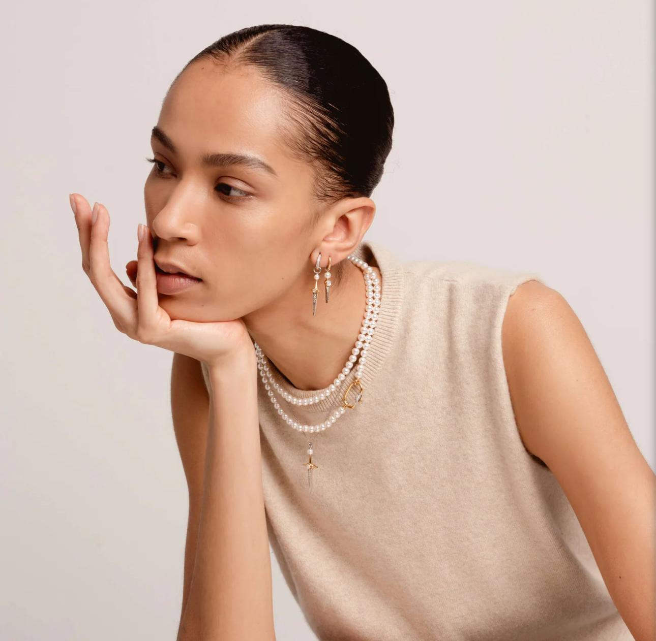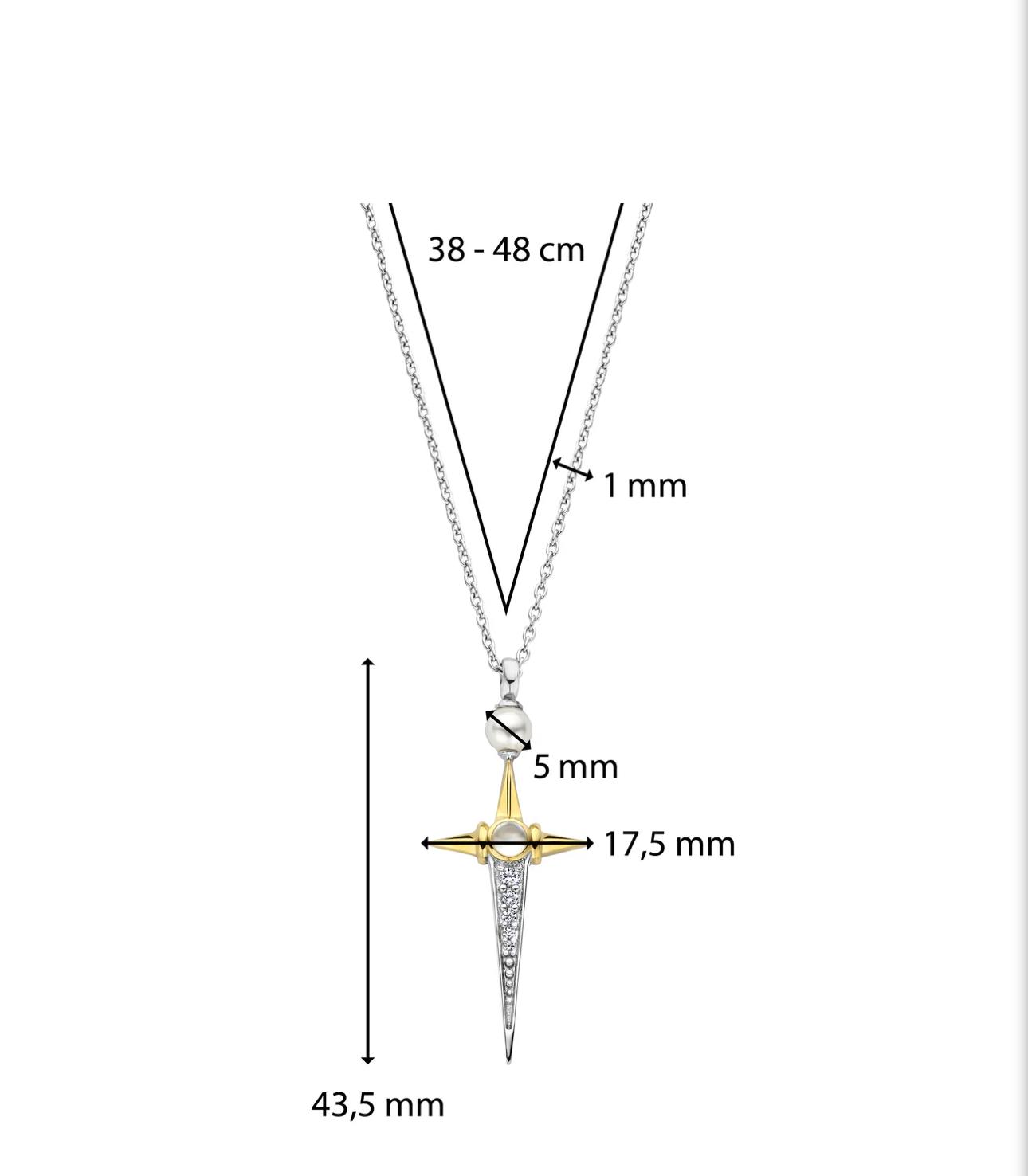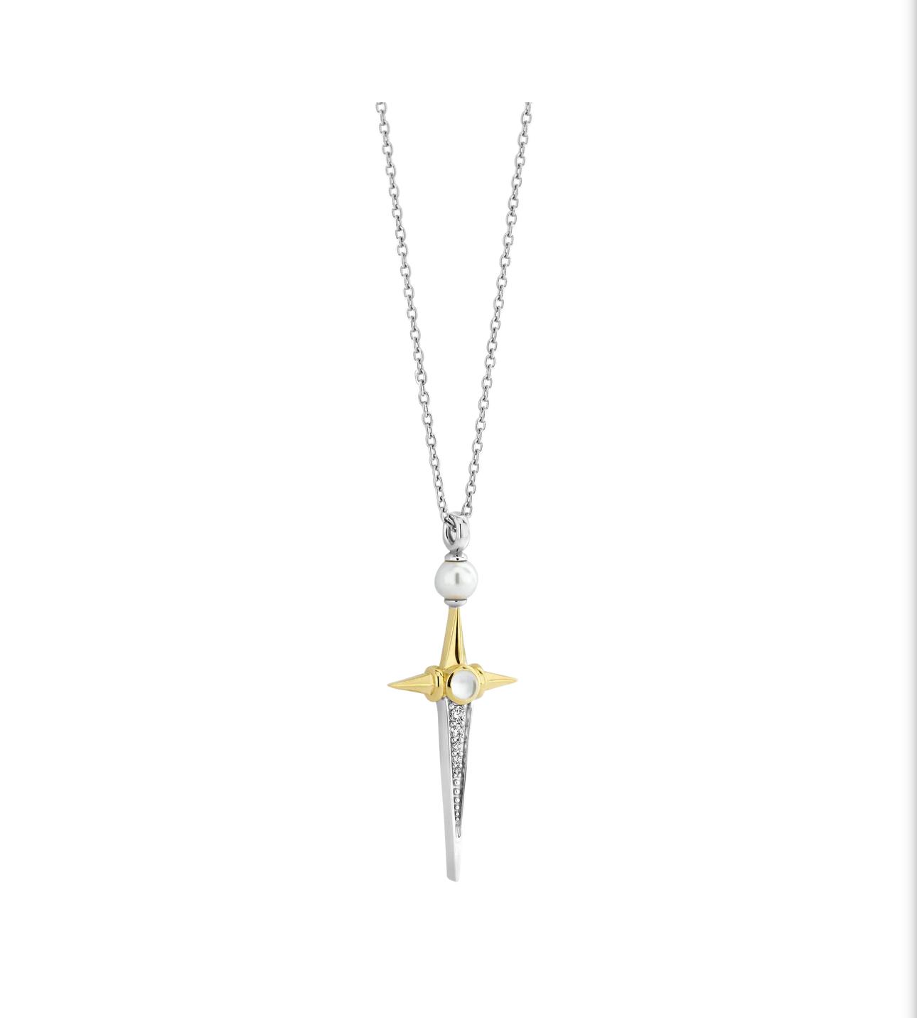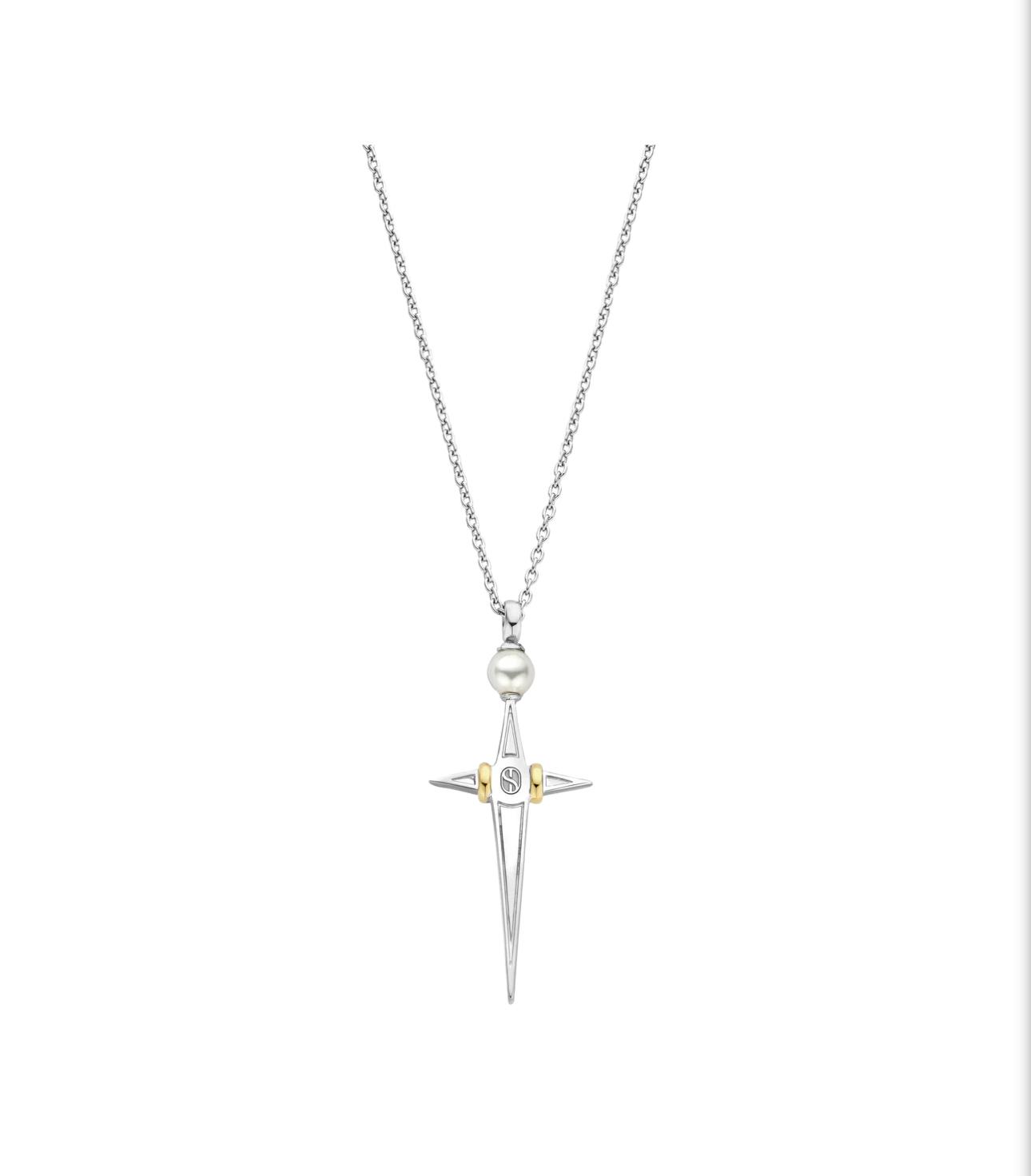 Ova Ti Sento ogrlica ima izduženi oblik zvezde ukrašen sjajnim biserima, sanjivim sedefom i blistavim zutim zlatom. Biseri su suprotstavljeni oštrim oblicima stvarajući savršen balans između svetlosti i tame. Podignite svoj stil i prigrlite magiju nebeske elegancije uz ovo zadivljujuće blago.