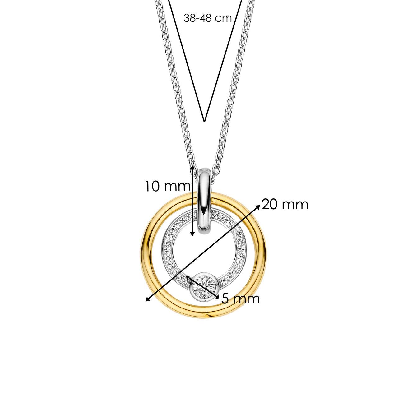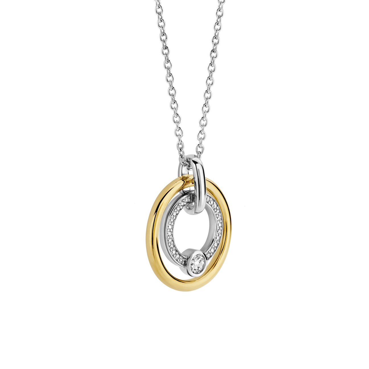 Prepustite se bezvremenskoj eleganciji uz ovu Ti Sento ogrlicu. Izrađena od srebra 925 i pozlaćena luksuznim žutim zlatom, ova ogrlica ima očaravajući privezak sa dva kruga. Unutrašnji krug svetluca blistavim slojem kubnih cirkona . privlačeći pogled na centralni okrugli beli kamen koji prelepo hvata svetlost. Topli sjaj zlata dodaje dašak raskoši ovom već zapanjujućem komadu.