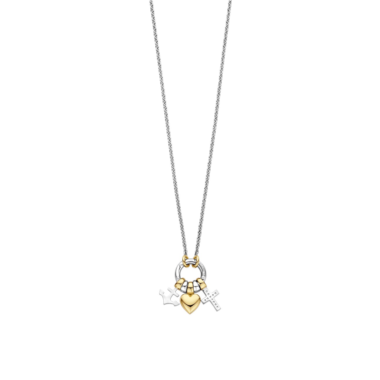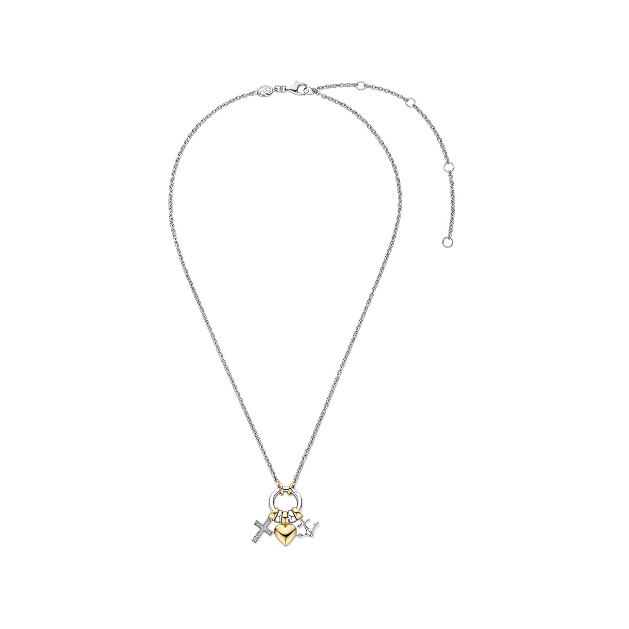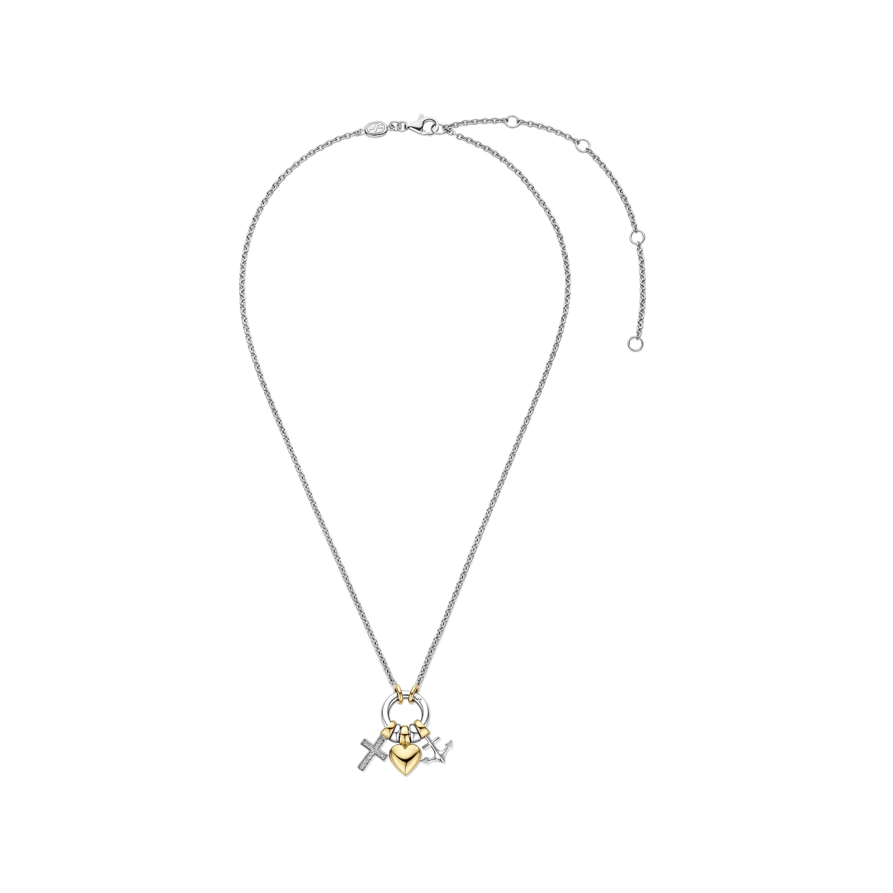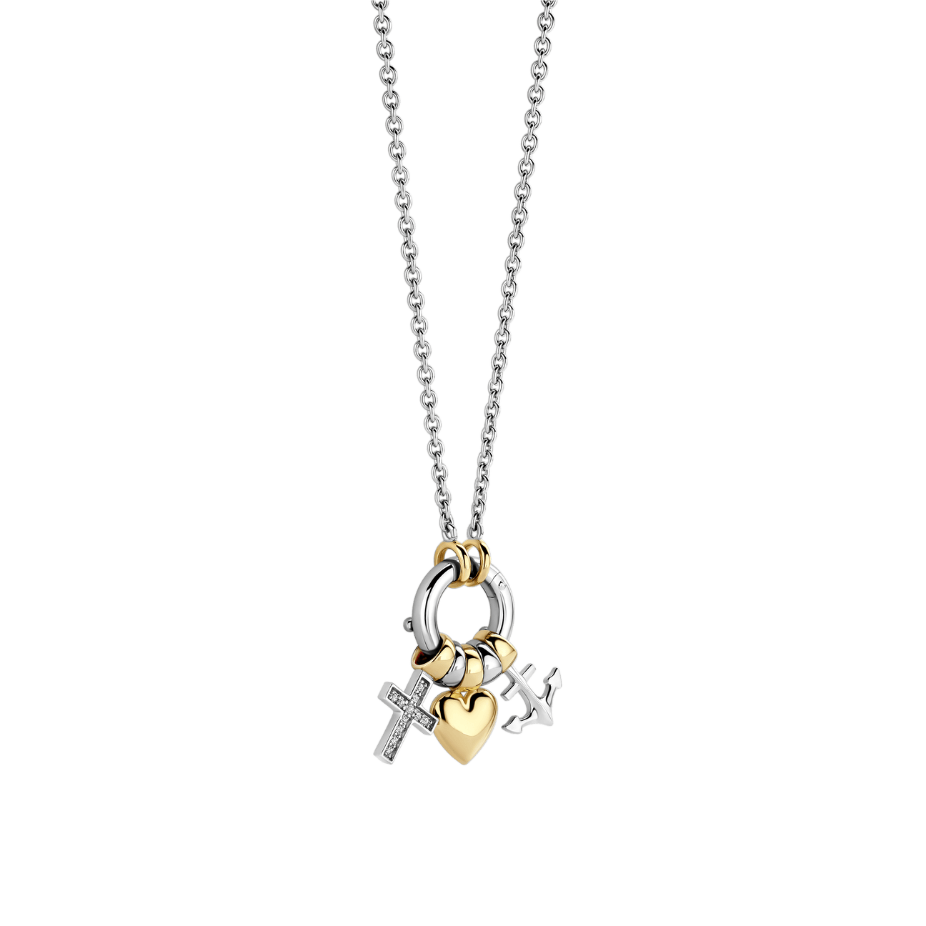 Proslavite simbole povezanosti sa ovom ogrlicom. Izrađena od vrhunskog srebra 925 i završena žutim pozlaćivanjem, ona prikazuje tri značajna priveska: krst u pave tehnici, polirano srce i elegantno sidro. Okačen na srebrno-zlatni prsten, svaki privezak se igra kontrastom i sjajem, odjekujući temama ljubavi, vere i nade.