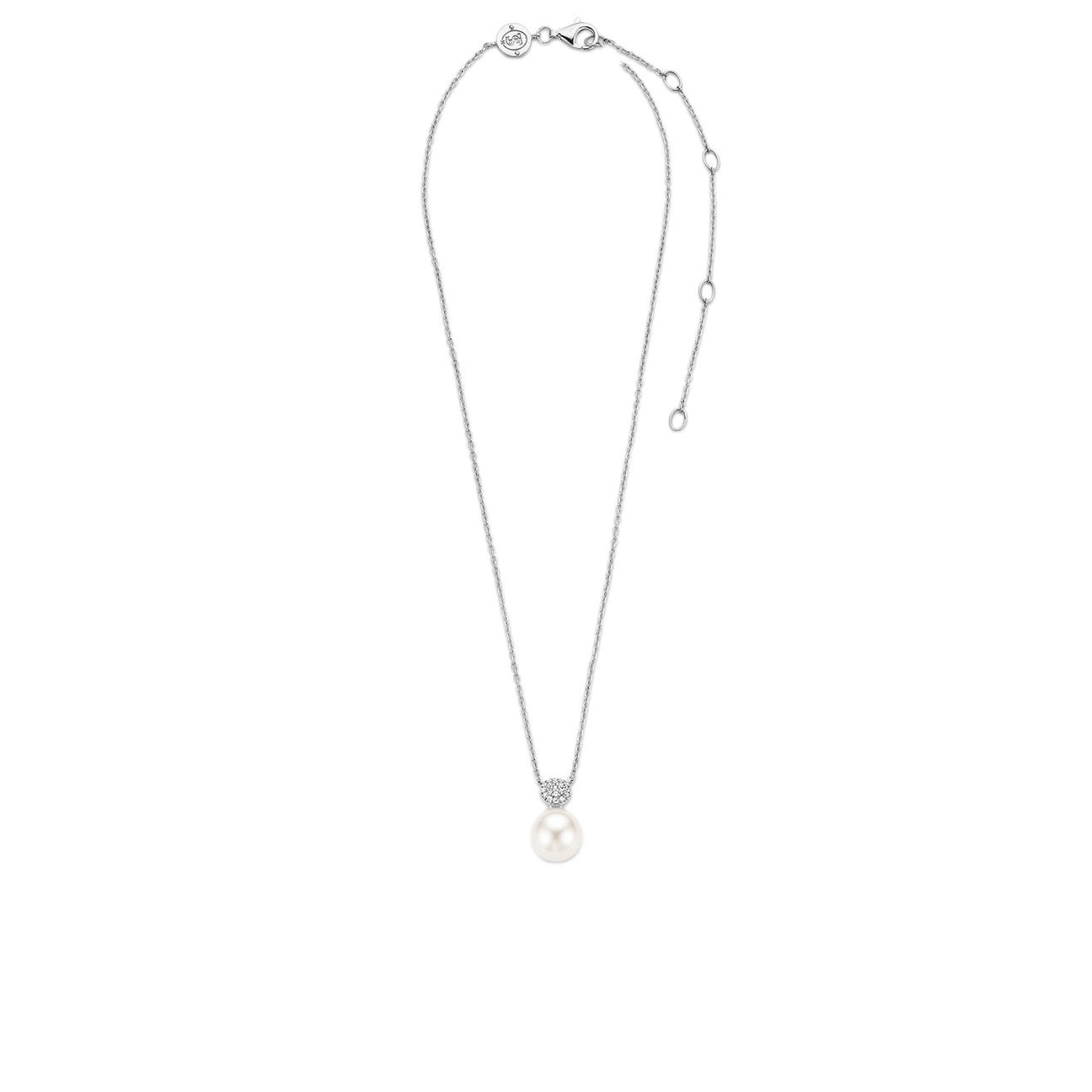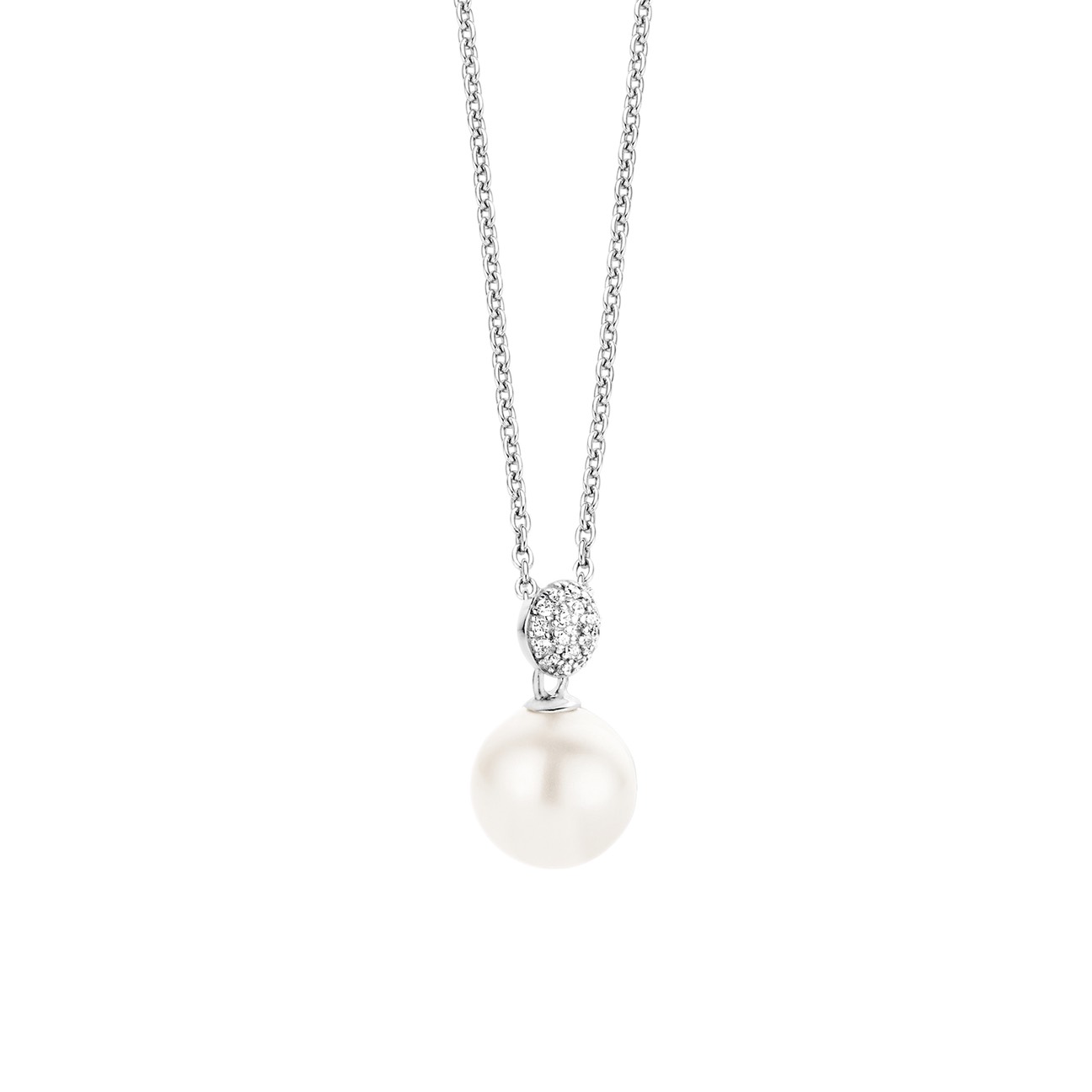 U srcu ove Ti Sento ogrlice nalazi se biser koji je pričvršćen za disk ukrašen cirkonima kao dodatim lepim detaljem. Ogrlica je napravljena od srebra i završno obrađena rodijumom, što ovaj komad nakita čini sjajnim i izdržljivim.