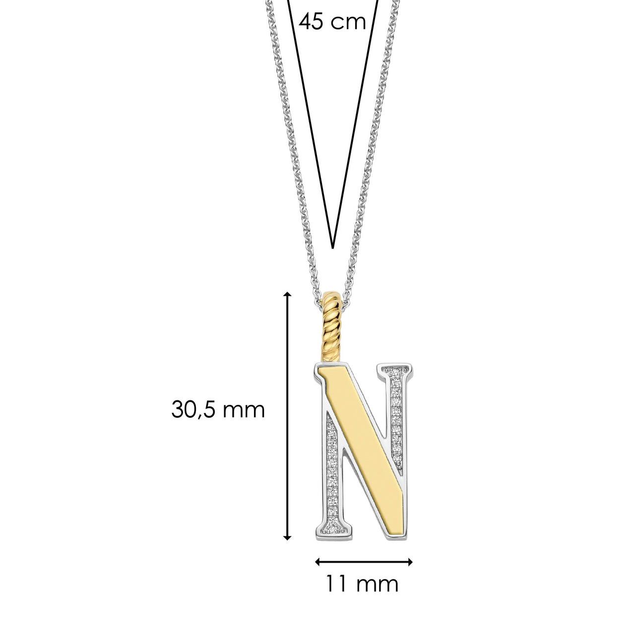 Ovaj prefinjeni privezak sa premazom od žutog zlata formira slovo N i stvara zadivljujući kontrast sa belim cirkonima. Izrađen je od sjajnog srebra 925 i presvucen dragocenom platinom da bi se zaštitio i zadržao sjaj. Premaz od žutog zlata svetluca toplinom, evocirajući sećanja na dane obasjane suncem. Slovo N simbolizuje novinu, otelotvorujući duh savremenog stila. Ovaj privezak je više od običnog nakita, to je platno za vaše samoizražavanje.