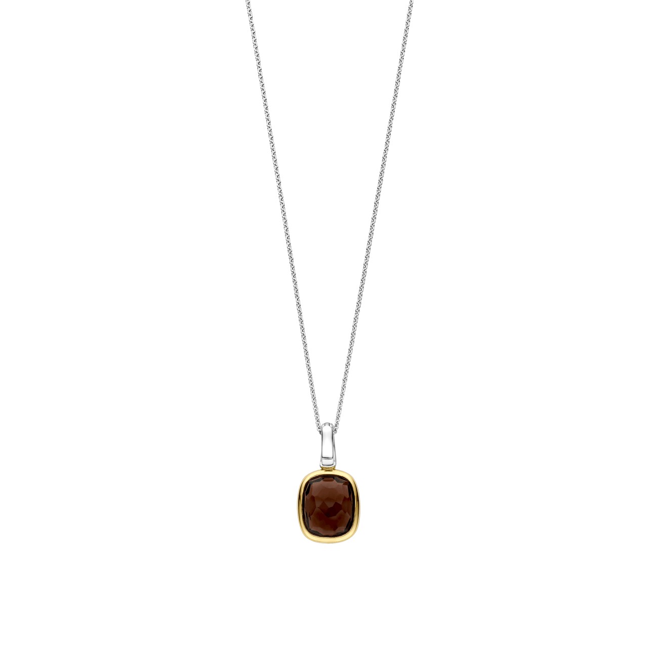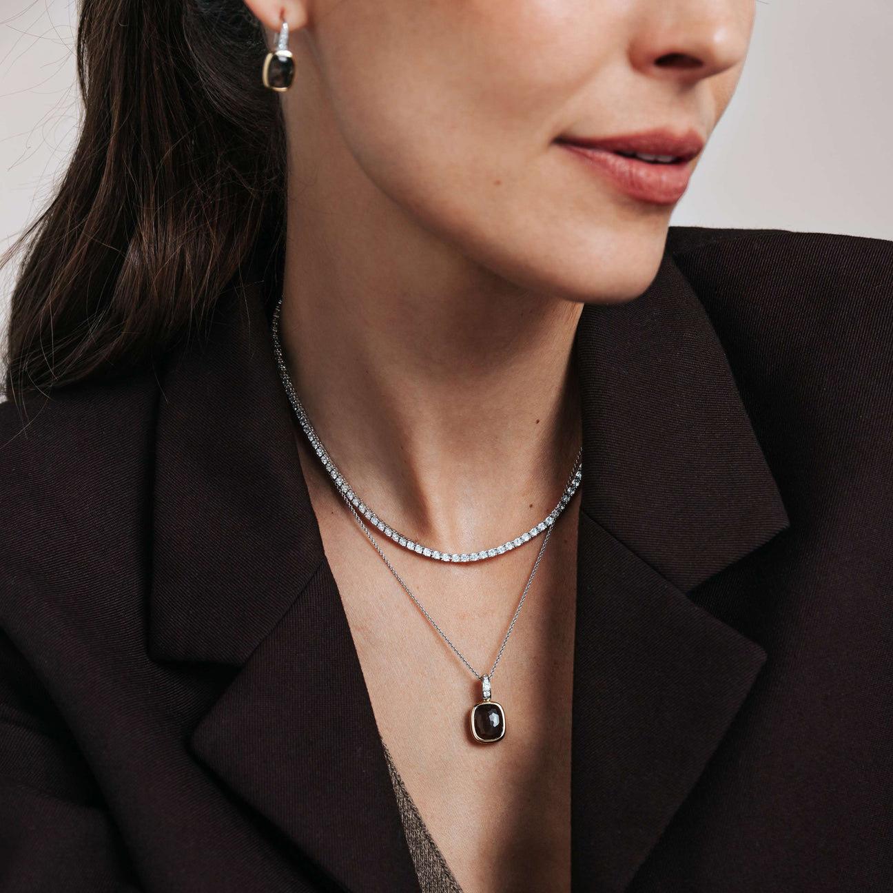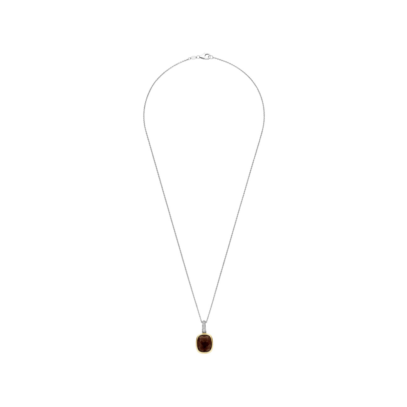 Dodajte toplu dubinu uz ovaj pozlaćeni srebrni privezak. Izrađen od srebra 925 izduženi oblik jastuka drži prozirni smeđi kamen bogatog tona i nežno fasovan kako bi reflektovao svetlost. Pozlaćeni okvir uokviruje kamen suptilnom toplinom, dok platinasta ivica ukrašena cirkonima dodaje prefinjen sjaj iznad. Privezak dolazi sa nežnom srebrnom ogrlicom od lanca.