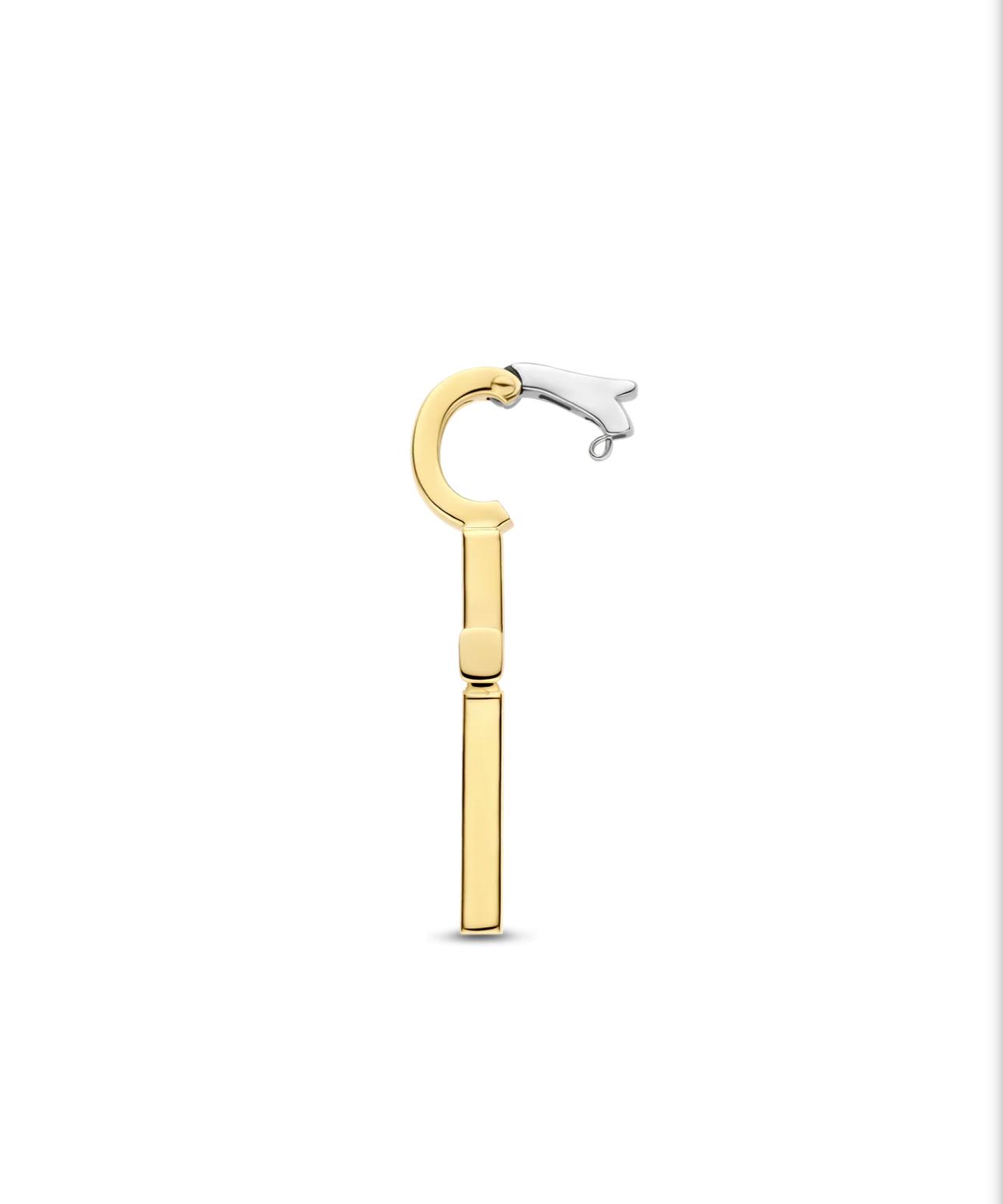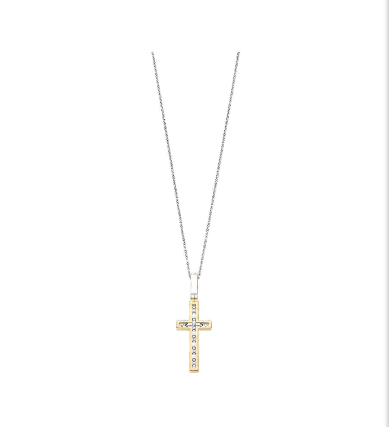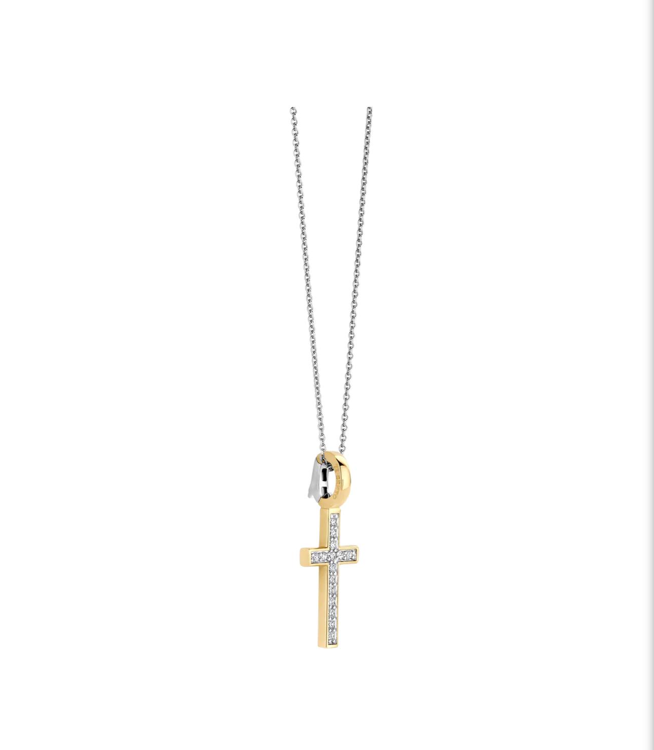 Ovaj privezak je izrađen od srebra 925 i završen je blistavom žutom pozlatom. Njegova silueta krsta je ukrašena briljantnim kubnim cirkonima, koji svetlucaju tihom snagom i jasnoćom. Kontrast između toplog zlata i blistavog kamenja donosi bezvremensku simboliku i prefinjenu ravnotežu.