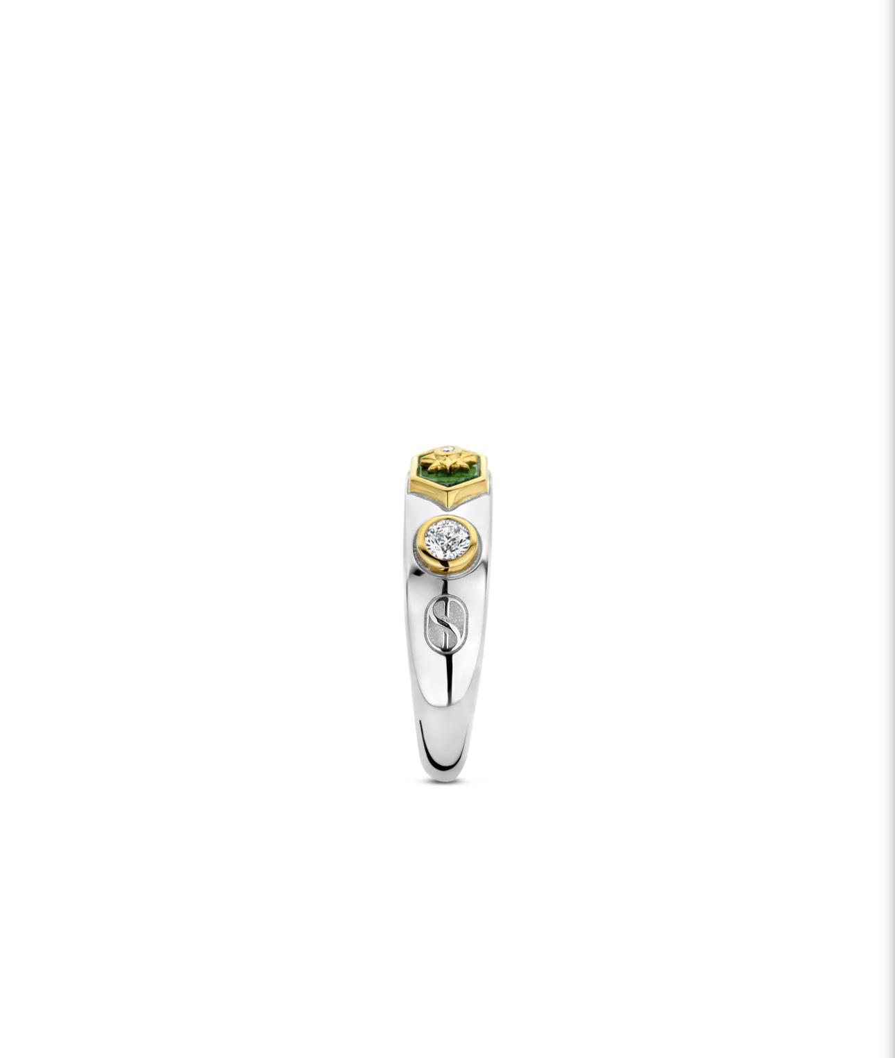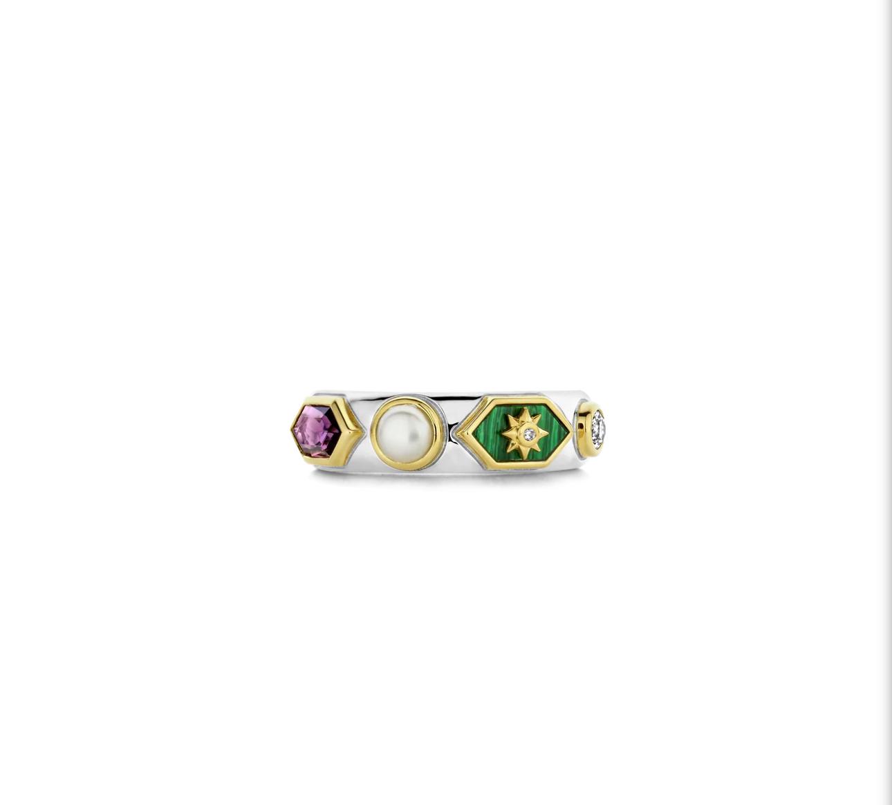 Ovaj srebrni prsten je kombinacija malahita, ametista, cirkona i sjajnih bisera. Svi ovi zapanjujući kamenčići su ručno umetnuti u blistave žute pozlaćene okvire. Izrađen je od najkvalitetnijeg srebra i presvučen žutim zlatom.
