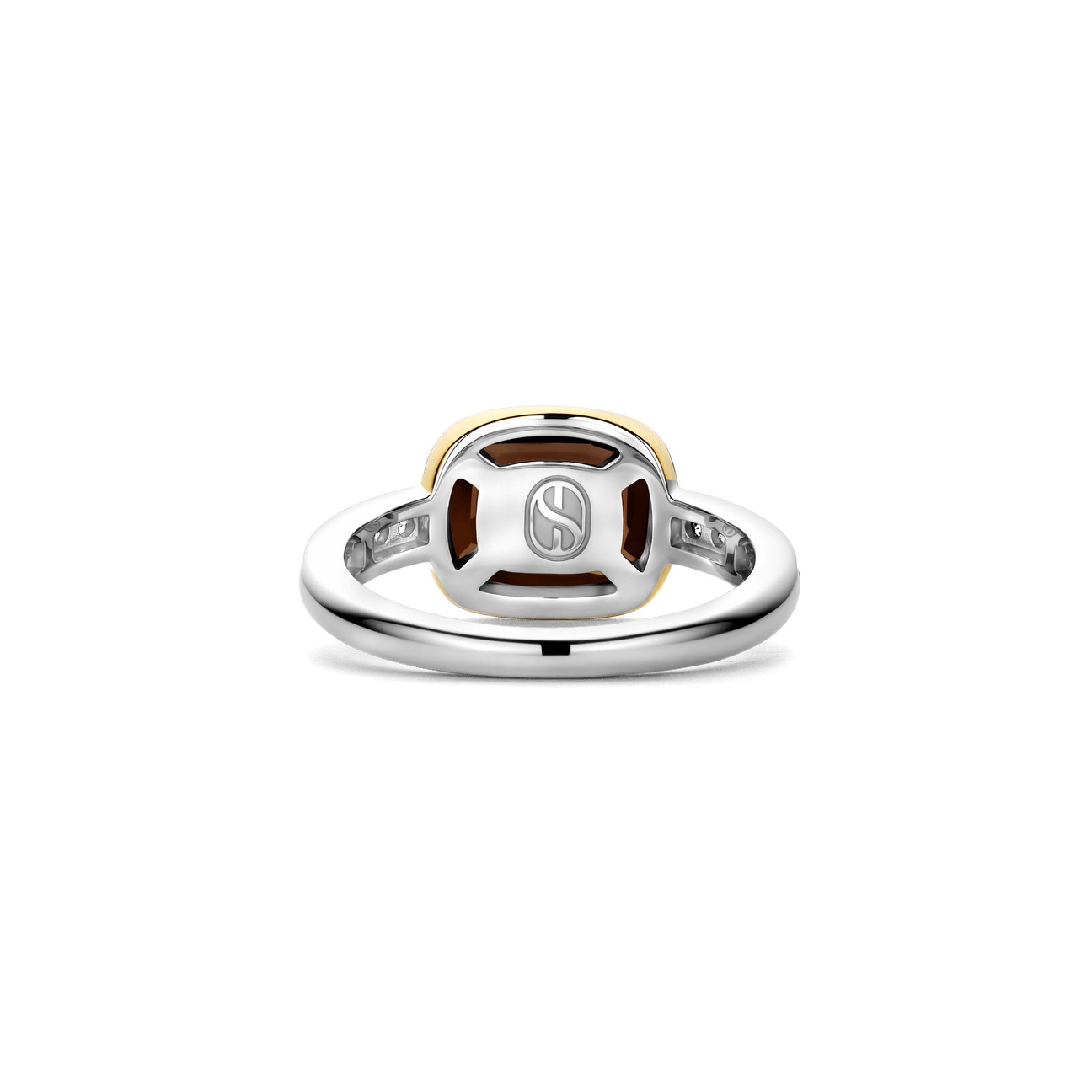 Prigrlite toplu eleganciju uz ovaj pozlaćeni srebrni prsten. Njegov dizajn karakteriše meki kamen u obliku jastuka u providnoj dimljeno smeđoj boji, suptilno fasovan kako bi reflektovao svetlost sa nežnom dubinom. Kamen je uokviren glatkim žuto-zlatnim okvirom, dok je platinasta traka obložena briljantno brušenim cirkonima.